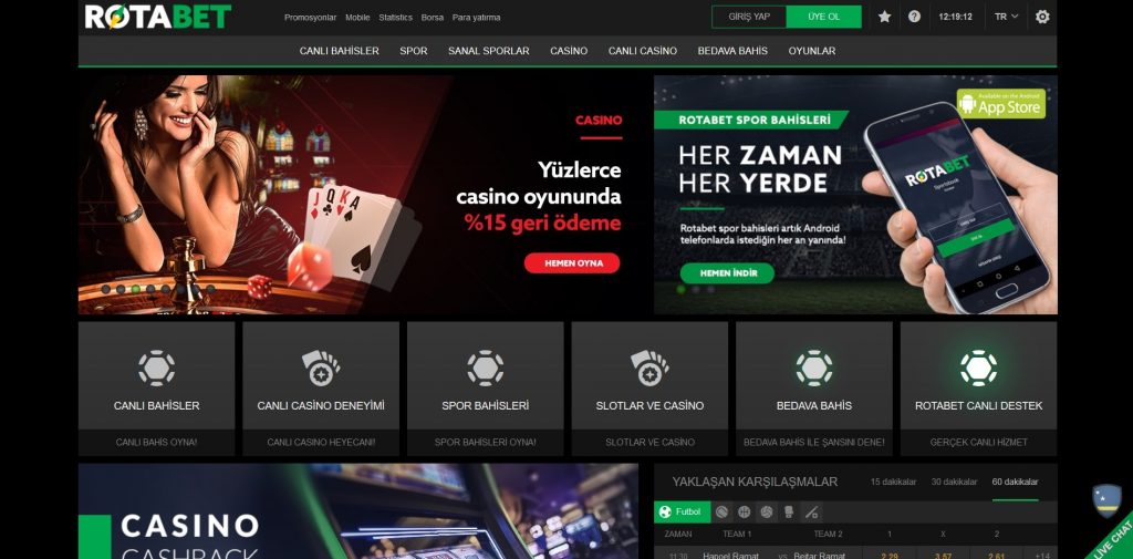 ABD haricinde bütün dünyadan üye kabul etmekte olan Rotabet bahis sitesi tamamen koyu renklere yer verilen bir kurmacama sahip. Türkçe, İngilizce, Ştalyanca, Fransızca, Almanca ve İspanyolca dillerinde gösterim meydana getirilen sitede 40’ın üzerinde spor dalına ve e-spor seçeneklerine bahis yapılabilmekte. 2014 seneından itibaren hizmet veren site ortalama üzeri bahis oranları ve birbirinden farklı bahis türü ile futbol, basketbol, tenis, voleybol, beyzbol şeklinde pek çokr spor dalı için geniş bahis seçenekleri sağlamaktadır.
