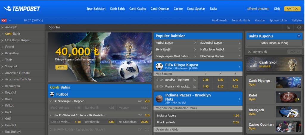 Alt parçaya doğru indikçe geçindiren karşılaşmaları, dakika skor ve oranları ile birlikte görebilirsiniz. Tempobet bu sistem ile spor bahisleri ve canlı bahis standardını de kanıtlamış oluyor. Canlı bahis platformları içinde Tempobet, bonusları ve kampanyaları ile de ismindan sıkça söz bahis firmaları içinde yer almıştır. Takdiri hak eden bir platform olarak her vakit dikkat çekmektedir. 2015 yılında kurulmuş olan Tempobet online bahis platformu Betconstruct altyapısı ile bahis yaşamını sürdürüyor.